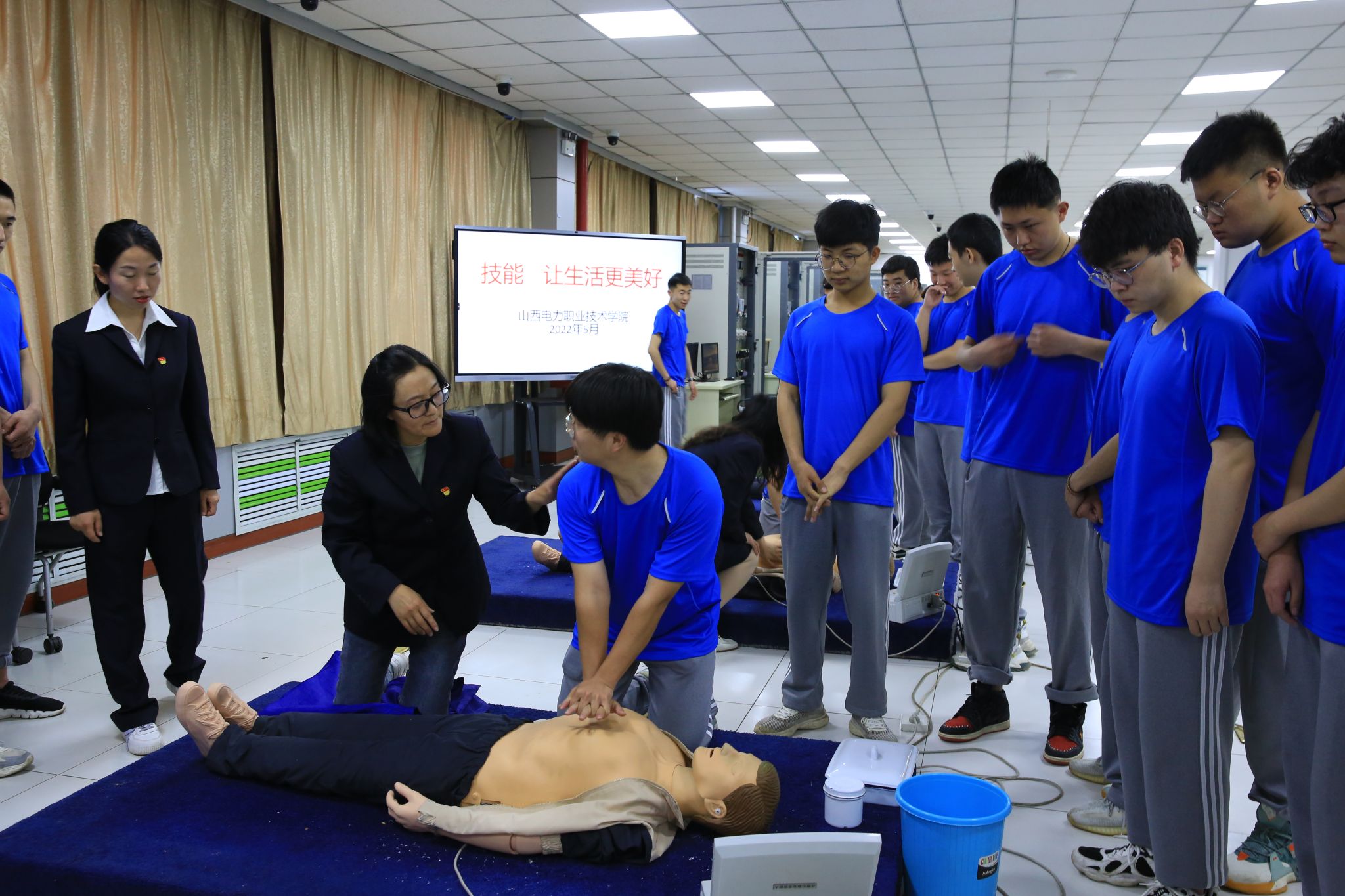 2022年职业教育活动周是新修订的职业教育法正式施行后的第一个活动周,为了宣传职业教育“前途广阔、大有可为”,营造全社会关心支持职业教育的良好氛围,山西电力职业技术学院开展了以“技能:让生活更美好”为主题的系列活动。2022年5月23日,学院全面开放实训室,在学院思行楼四层触电急救实训区、低压排故实训区开展了触电现场急救、心肺复苏、低压回路故障排除等技能体验活动,并在行知楼五层智能测控实训区开展了现代电气控制系统设计大赛的校赛选拔活动。
