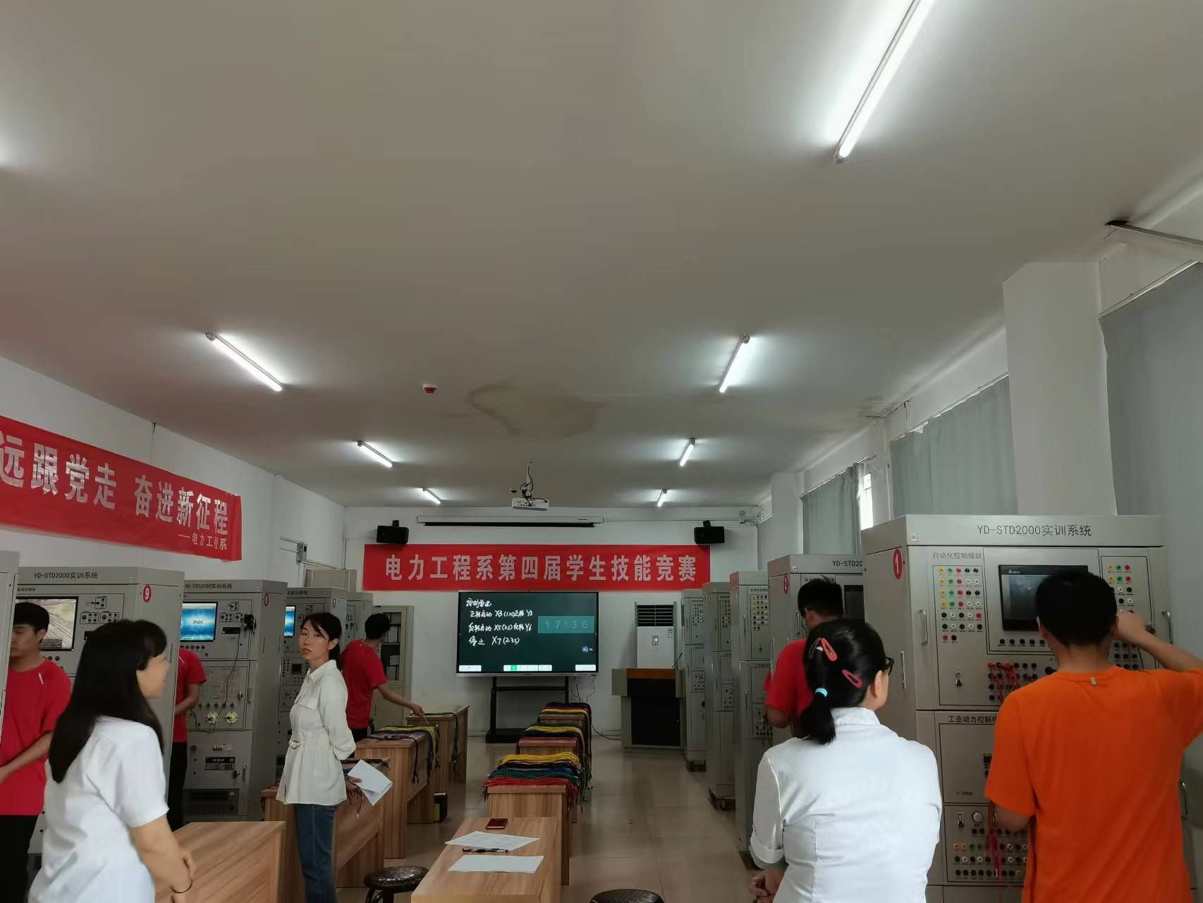 在活动期间,教师们通过施救准备、脱离电源、判断处置、现场心肺复苏、复苏评估五个环节指导学生心肺复苏实操训练;通过送电观察正常状态、停电设故障、送电观察故障现象、停电排查故障、送电检验故障排查结果等环节指导学生们低压回路故障排除项目实操训练;通过导线制作、绘制主电路和PLC电路接线图、完成控制系统的主控程序设计和I/O硬件接线、触摸屏通信接线、PPT汇报等环节对同学们进行现代电气控制竞赛项目选拔。同学们都表现出高度的热情和浓厚的专业兴趣,所有同学都能够认真执行安全操作规程,在教师指导下进行技能体验,活动达到预期效果,取得圆满成功。