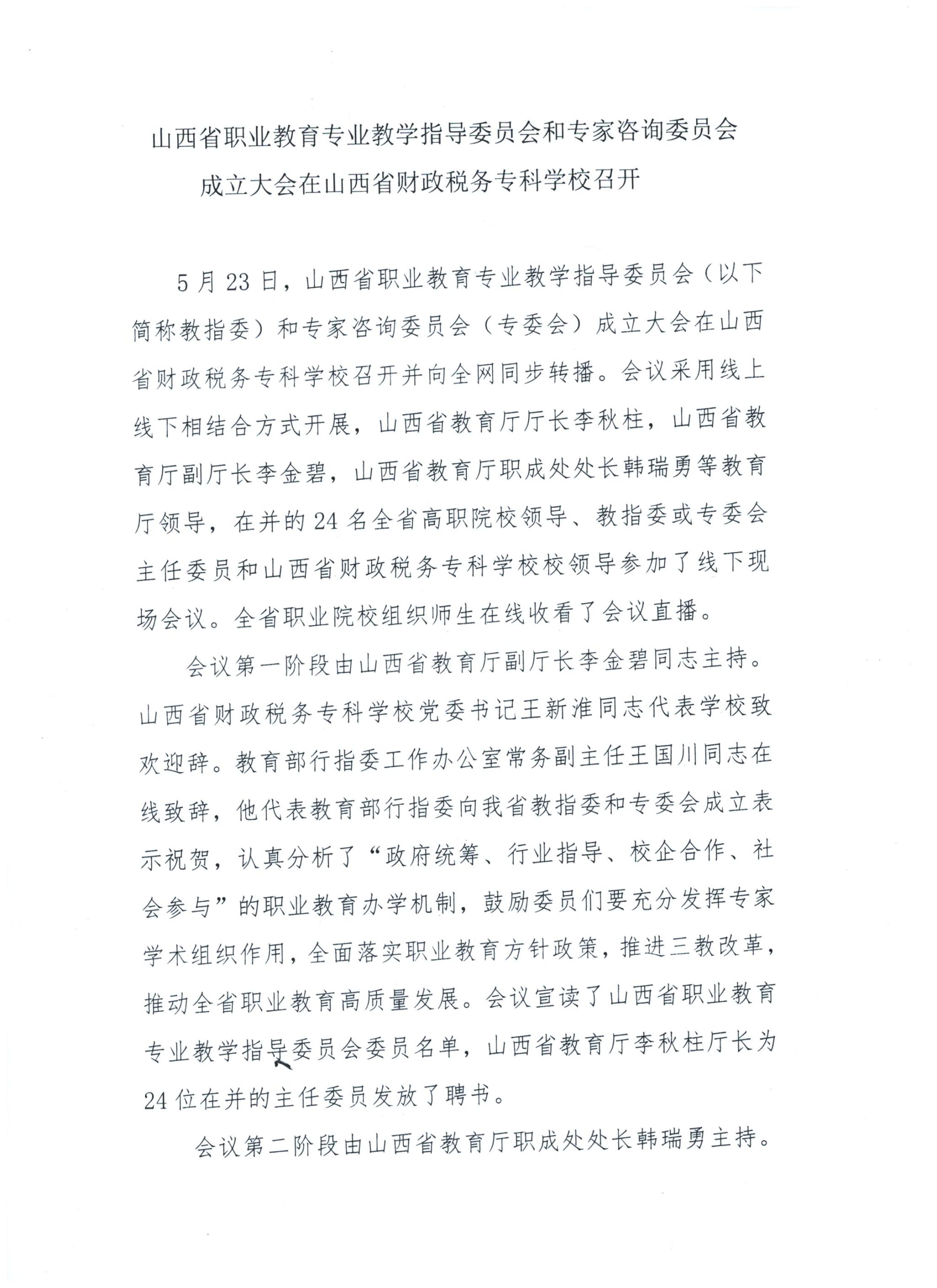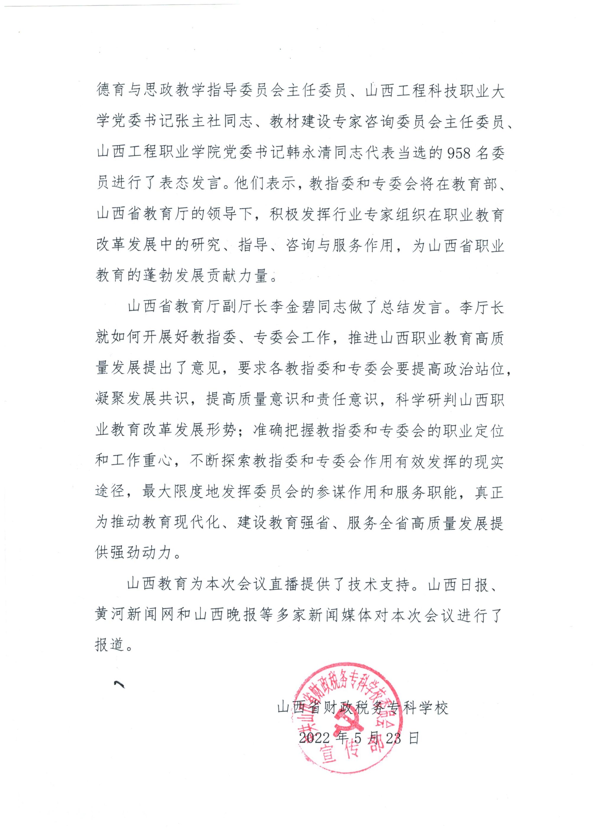 5月23日,山西省职业教育专业教学指导委员会(以下简称教指委)和专家咨询委员会(专委会)成立大会在山西省财政税务专科学校召开并向全网同步转播。会议采用线上线下相结合方式开展,山西省教育厅厅长李秋柱,山西省教育厅副厅长李金碧,山西省教育厅职成处处长韩瑞勇等教育厅领导,在并的24名全省高职院校领导、教指委或专委会主任委员和山西省财政税务专科学校校领导参加了线下现场会议。全省职业院校组织师生在线收看了会议直播。