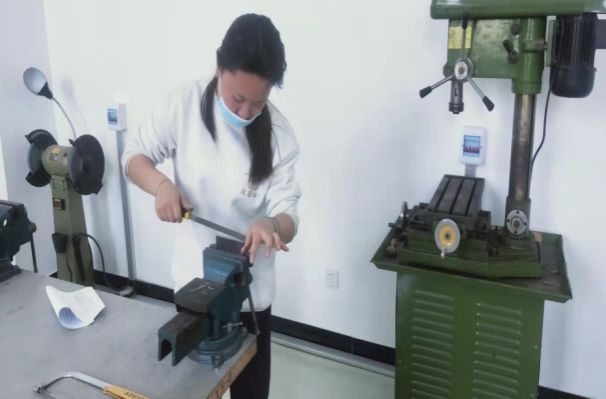 赛场上,同学们熟练地划线、锯割、锉磨……台钻声、锉刀声、敲打声……此起彼伏,比赛气氛紧张而激烈。大家热火朝天地作业,一个个挥汗如雨,同时又保持着一丝不苟的工匠精神作风。其中还有多名女生参赛,与众多男生同场争辉。