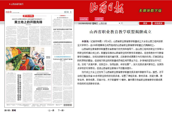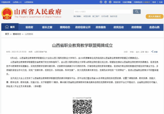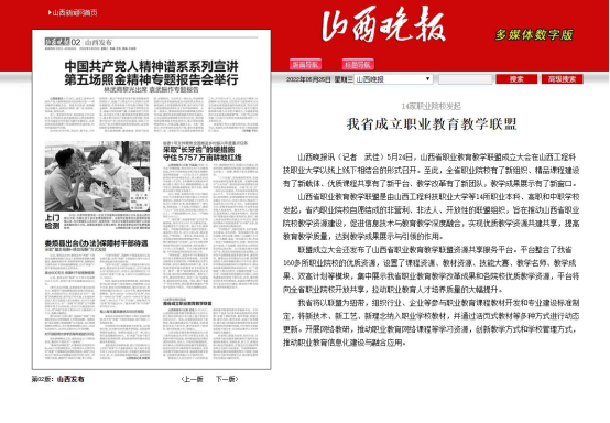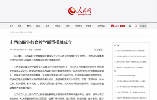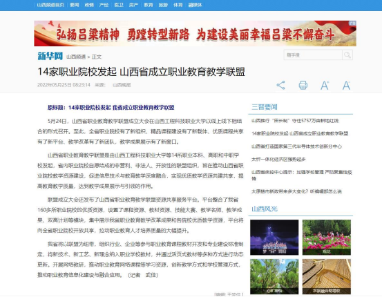 为共同推动优质教学资源建设,建立优质教学成果资源共享平台,促进职业院校相互间开展全方位、多领域的紧密合作与交流,打造职业教育品牌,5月24日,山西省职业教育教学联盟成立大会在我校隆重举行,吸引了人民网、新华网、山西省人民政府网站、《山西日报》、《山西晚报》、山西新闻网等中央及省级媒体广泛关注,《山西日报》《山西晚报》《山西教育》等新媒体客户端相继进行转载报道,全网转载量超1000余次,在社会各界引起强烈反响。