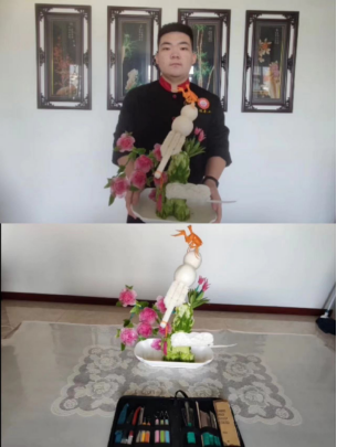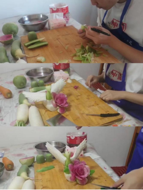 刀起刀落,精雕细刻。胡萝卜、青萝卜、黄瓜等常见食材经学子们的精心雕刻,幻化成活灵活现的花鸟虫鱼,跃然于盘上为餐桌增添就餐乐趣、丰富食客的视觉体验。