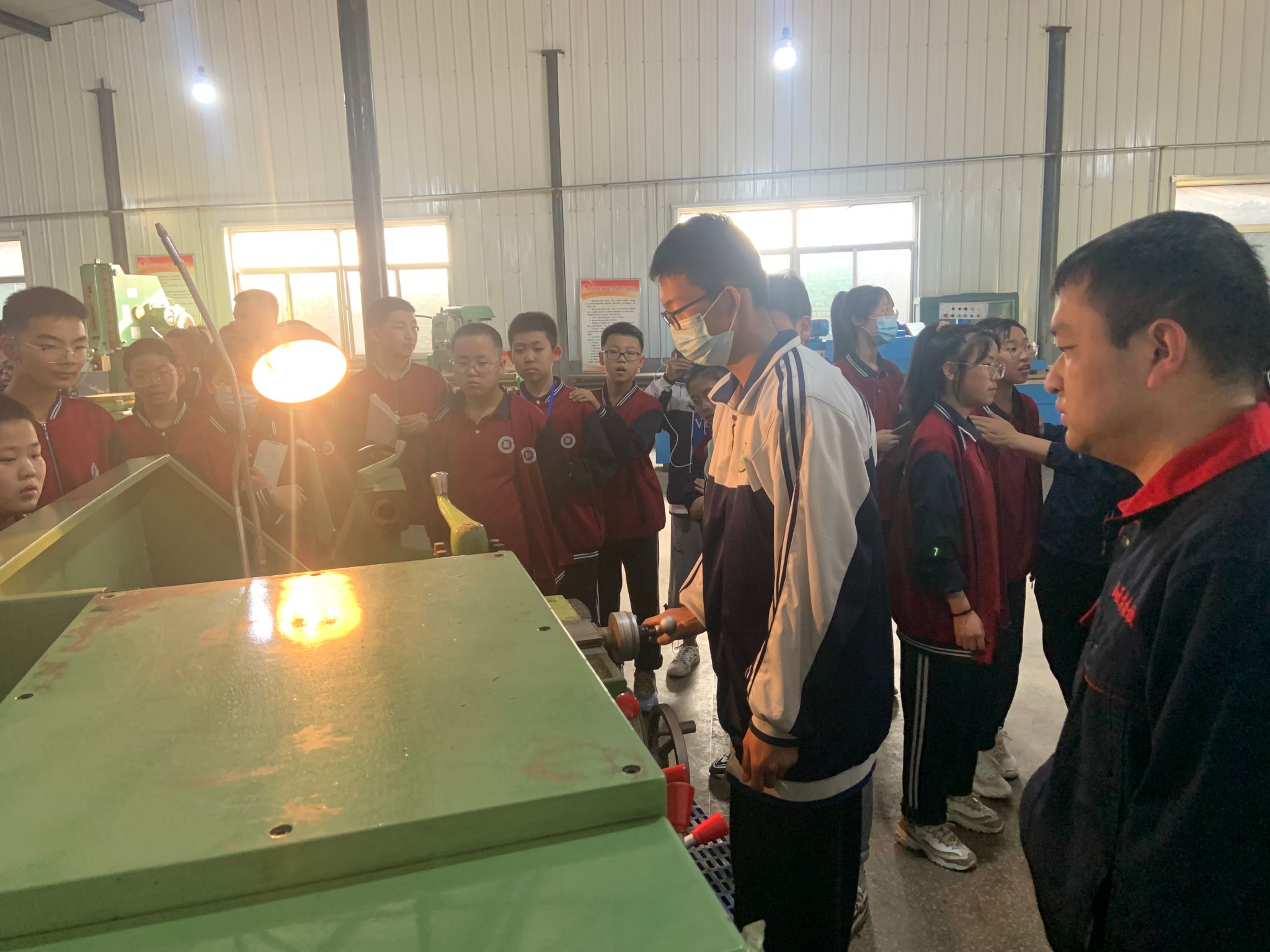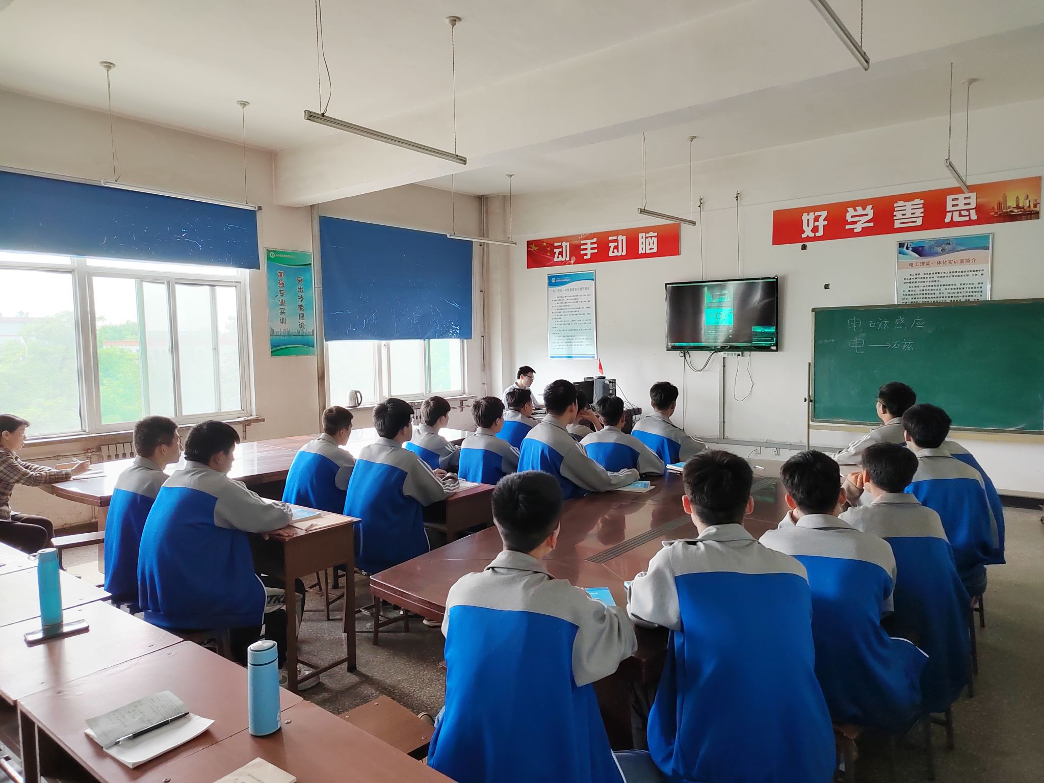 电气系进行了实验室开放参观和公开课教学活动。5月23日上午,电气系开放实验室,迎接了和诚中学的初中同学参观实验室。参观期间,实验室老师给同学们结合实际深入浅出讲解了供电和电子产品组装与调试等专业知识,展示了学生作品,同时和学生们一起操作,让学生们进行专业体验,同学们热情高涨、兴趣满满,流连忘返。下午,张庆老师进行了公开课教学,利用多媒体课件和视频素材讲解了“电磁感应”知识,通过直观的实验让学生搞清楚了比较抽象的磁通概念和左手定则等理论知识,通过“电和磁”相互转化、相互依存的关系渗透了事物之间矛盾统一关系的哲学思想。