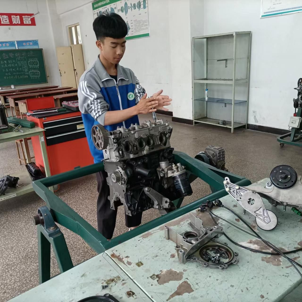5月23日上午,汽车工程系汽59班学生在郭学勤、赵越、郭瑞三位老师的带领下,进行了职业教育活动周项目展示,项目展示分两组,分别是:汽缸垫的更换技能展示与活塞环拆装比武。通过对汽缸垫的更换项目展示,同学们对汽缸垫更换的步骤与注意要点更加的清晰,学会了查询维修手册,规范使用工量具。通过活塞环拆装技能比武,同学们对活塞环的拆装更加熟练,能够熟练运用活塞环拆装钳,实操过程中计时比赛添加了些许的紧张。通过比武,同学们找到了自己在实操过程中的不足,对今后的技能提升有很大的帮助。观摩的有彭永宁副校长、教务主任李伍元、汽车系主任安志远等各位领导及老师,领导对学生踏实认真、刻苦训练的精神表示肯定,同时也鼓励继续努力,希望同学们要发扬勇于创新、精益求精的工匠精神,加强专业技能操作并以自己是一名职教生为荣。