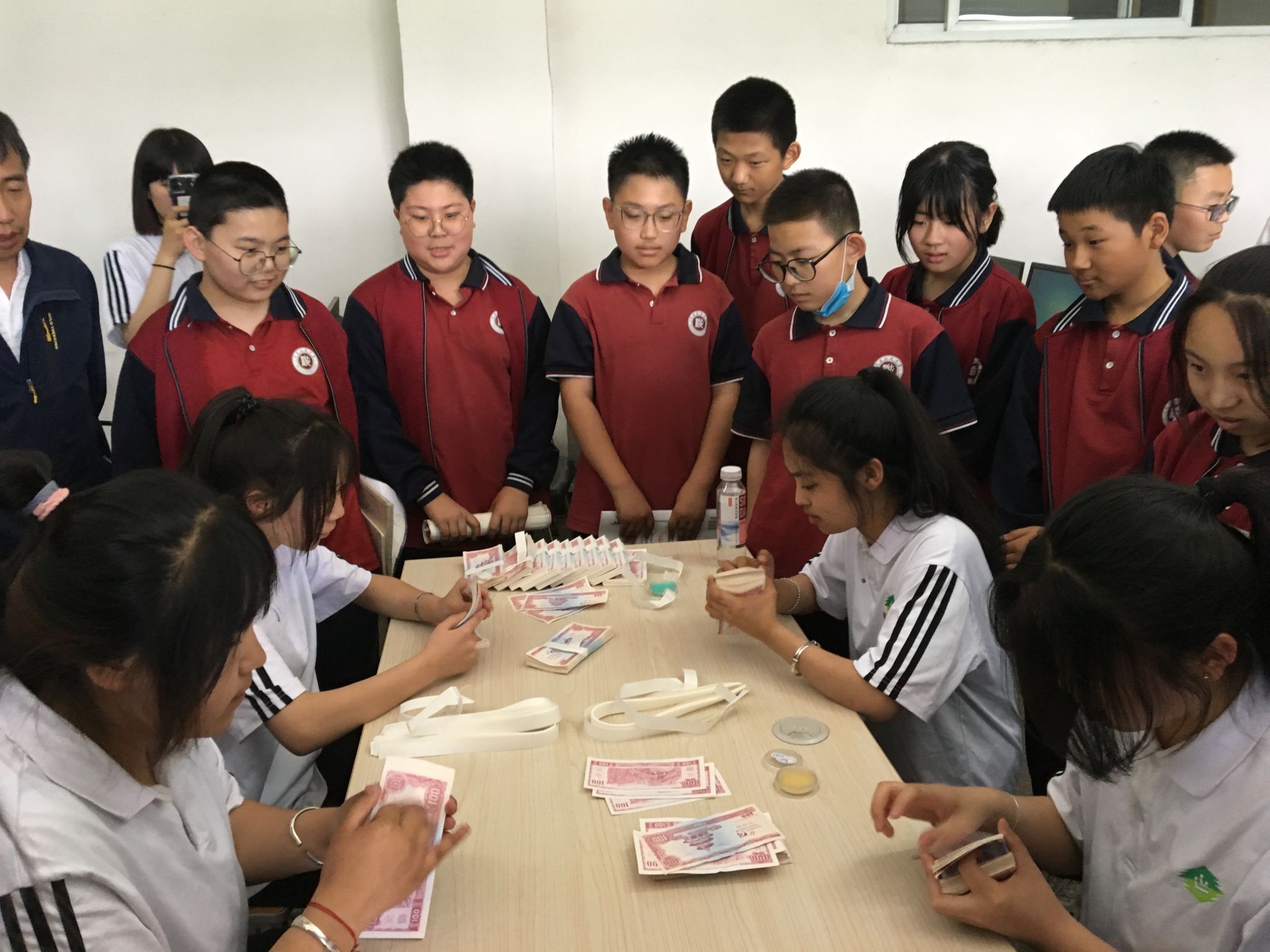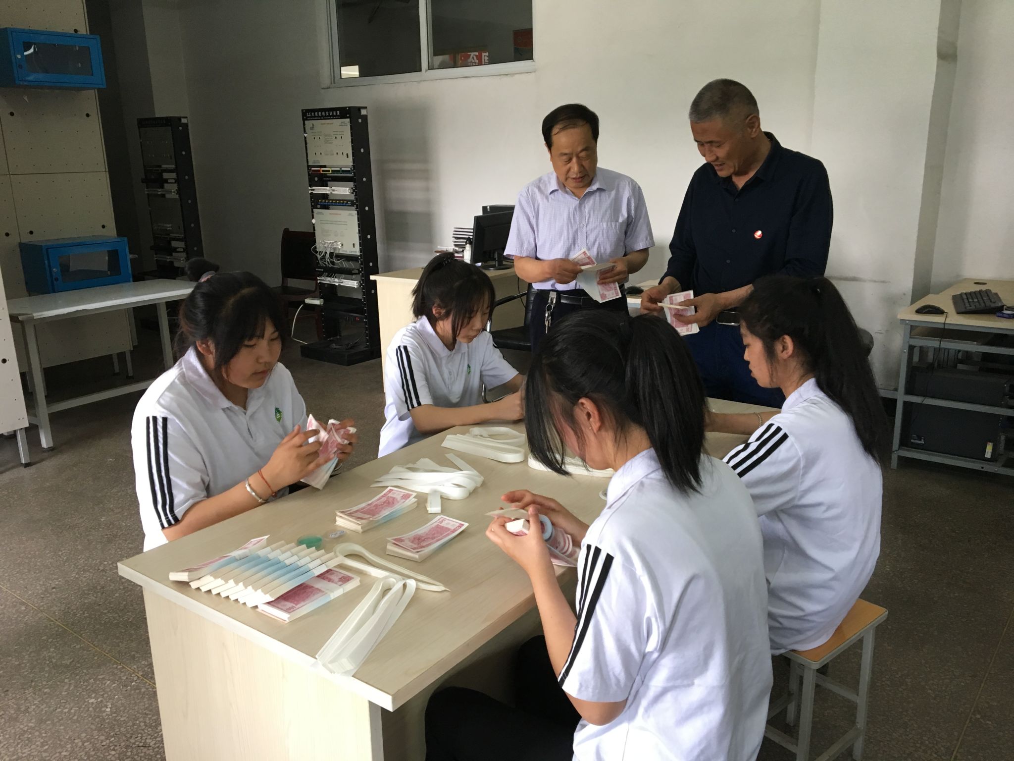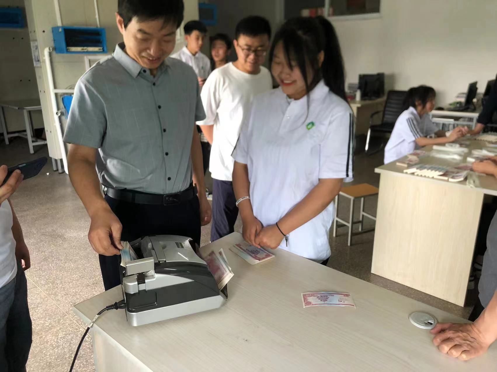 5月25日上午,计算机系在实训楼四层综合布线实训室进行了学生点钞技能展演。点钞技术适用于收款、付款和各种券别的整点工作,是财会人员必备的基本技能。学生现场展示“单指单张、多指多张”等不同点钞技术,并教授前来参观体验的初中部学生点钞技术要点。初中部学生兴致勃勃围着“师傅”虚心请教、不断尝试,最后通过验钞机确认数量是否准确。这次技能展示提高了学生点钞的速度与准确度,锻炼了学生的动手实践能力,营造浓郁的专业学习氛围,让学生进一步提升职业认同感。