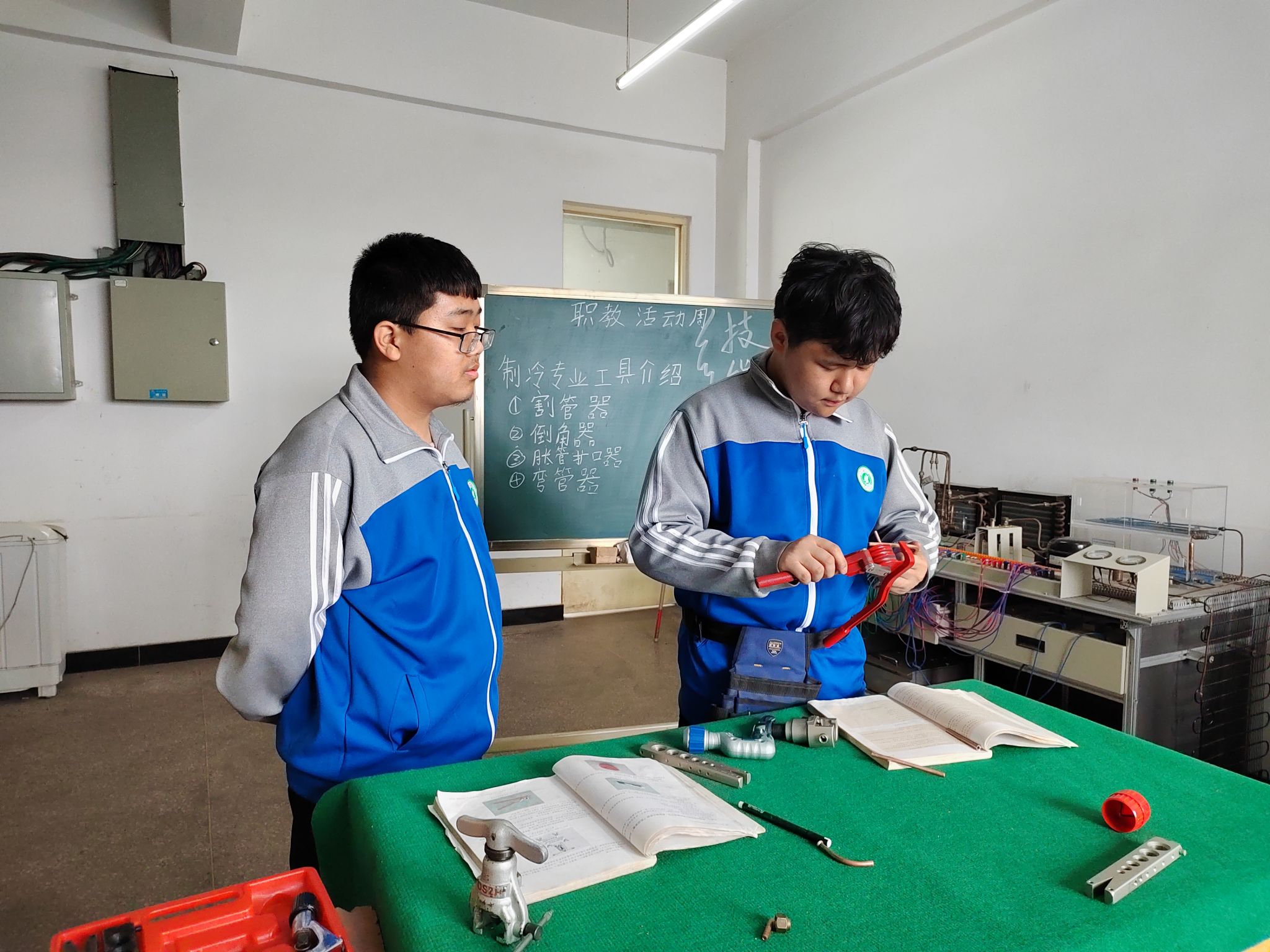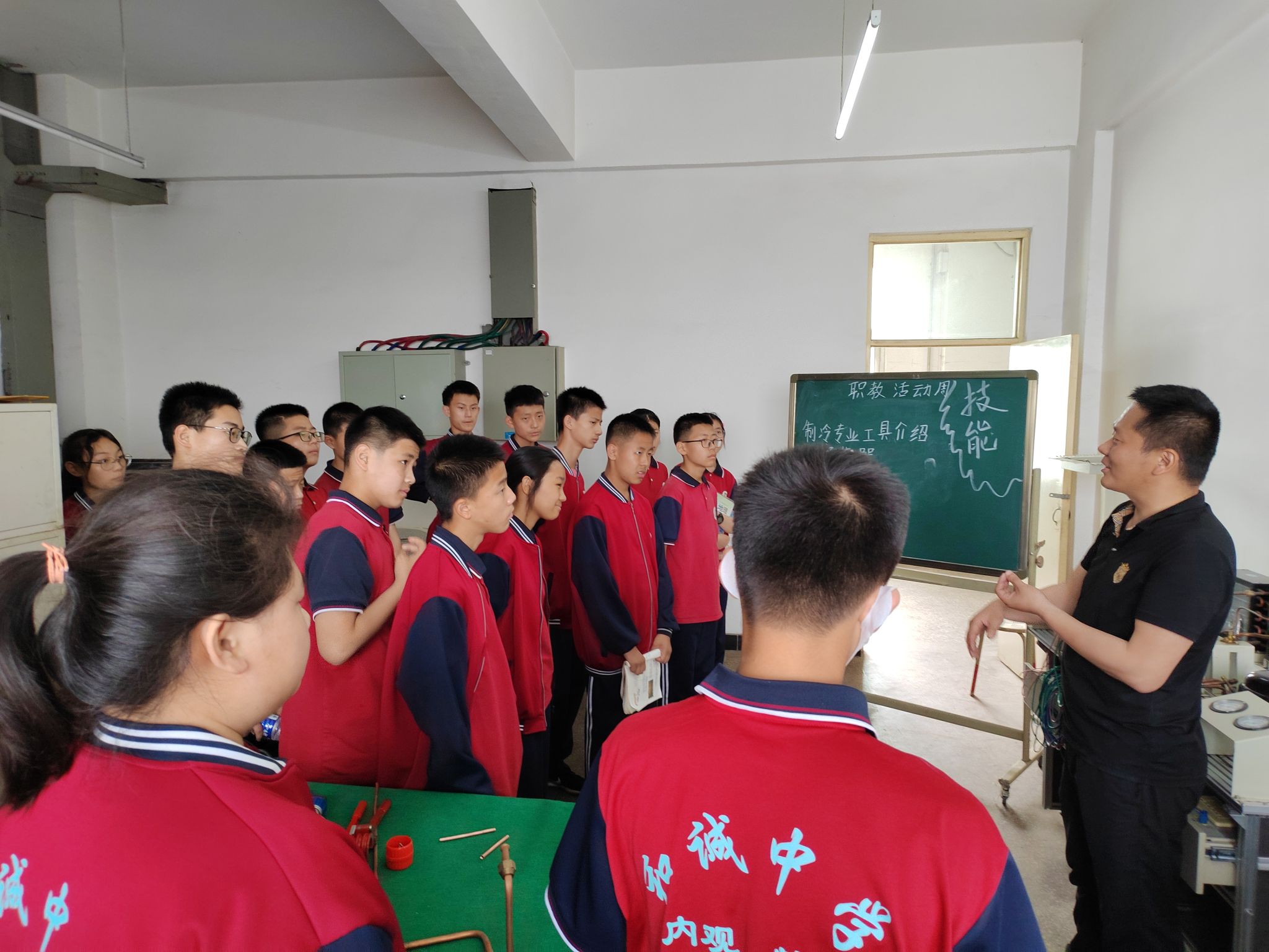 5月25日下午,电气系由贾晖负责的“制冷空调装调”学生技能竞赛项目进行了展演,参加训练的同学们把自己学到的知识和技能边讲解边演示操作。期间和诚中学的初一学生参观了展演,贾晖老师利用直观的技能实训台并结合家里的冰箱空调家用电器,深入浅出地给学生进行了讲解。同学们都在聚精会神地听讲,他们对职业教育和初中教育的截然不同有了初步的认识和体验,心中萌发了接受职业教育的种子。