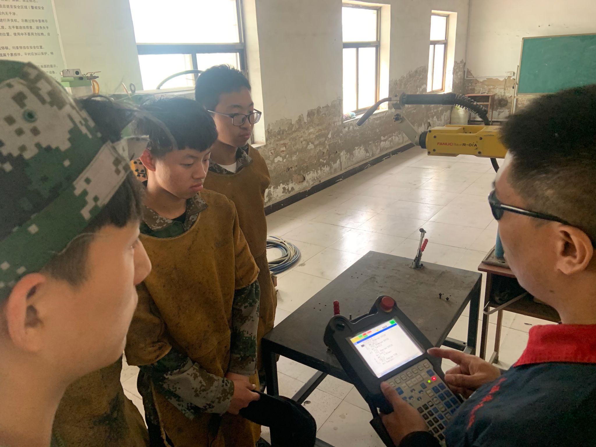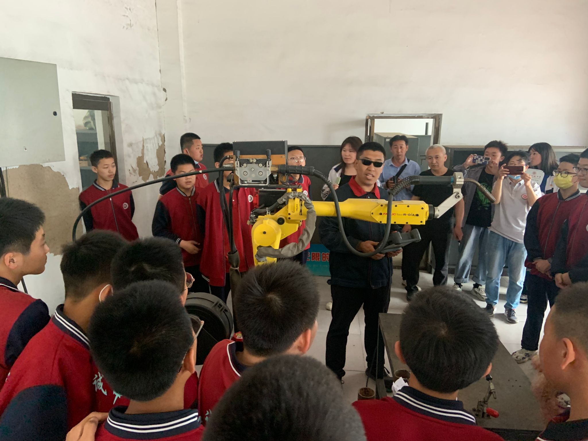 首先,毛育润老师组织同学们来到焊接机器人车间,董广宇老师对焊接机器人进行讲解。这台焊接机器人是日本FANUC公司的产品,有6个轴,通过6个伺服电机来控制。大家认真听讲,仔细观察焊接机器人的工作方式。