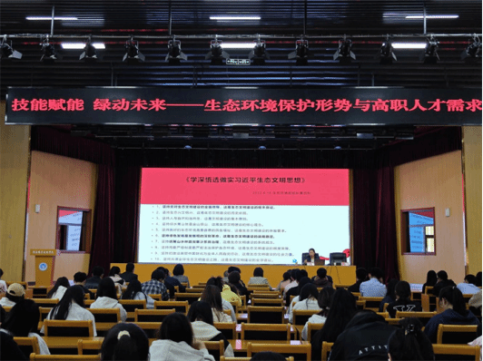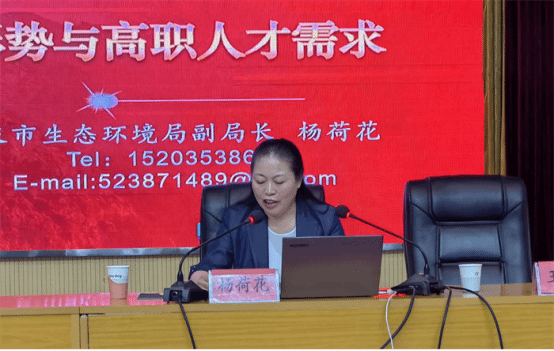 杨荷花副局长从习近平生态文明思想、全国全省生态文明的变迁、生态环境保护的人才需求三个方面,讲解当前时代背景下,环保类人才重点需求领域及应具备的技能和素质,并结合自身丰富的环保实战经验,分享了如何提升自身综合素养的方法,为老师们打开了环保类人才培养的新思路,为学生剖析了就业领域。