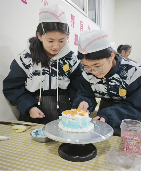 另一组在西点区体验的四中学生也是载笑载言,忙得不亦乐乎。他们在蛋糕胚上认真地涂抹着奶油,装饰出各种漂亮又极具创意的花型。