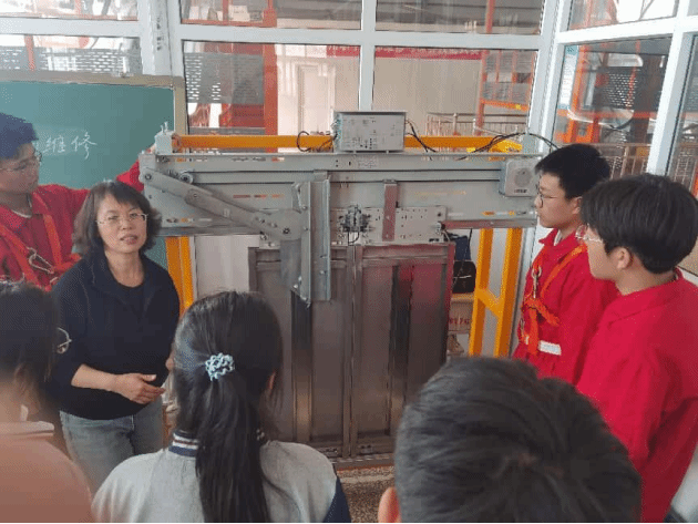 活动开场,王晓娜老师站在电梯设备旁,宛如一位知识的引路人,将复杂的电梯知识娓娓道来。她从电梯的基础构造讲起,机械结构的精妙、电气系统的复杂,在她生动的讲解下变得清晰易懂。同学们围聚在设备周围,眼神中满是好奇与专注,仿佛置身于一个充满奥秘的机械世界。