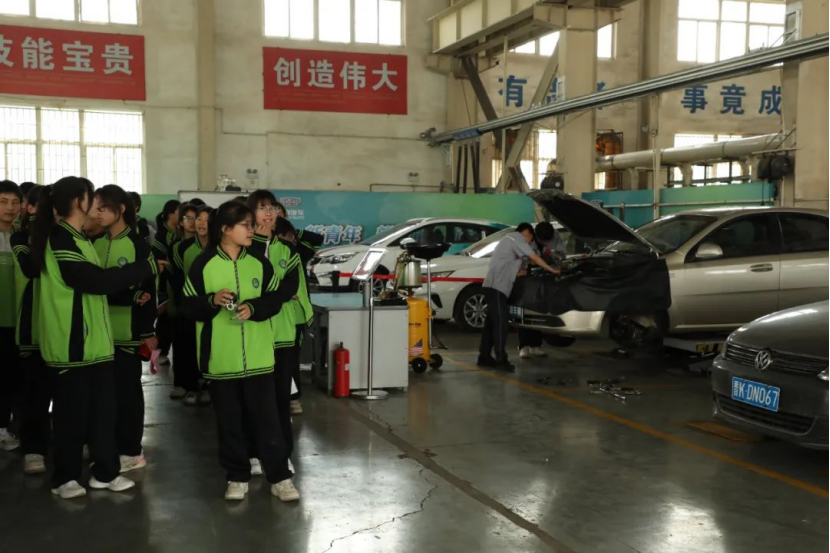 在焊接车间,焊接技术专业的学生们正在进行一场精彩绝伦的焊接技能展示。不远处,新能源汽修专业的学生正在演示电动汽车故障诊断,娴熟的操作引来阵阵赞叹。