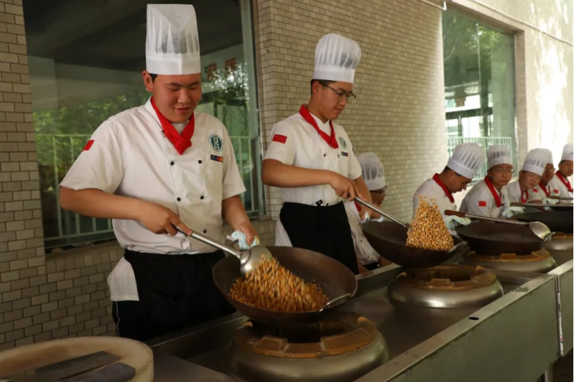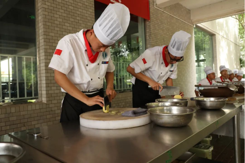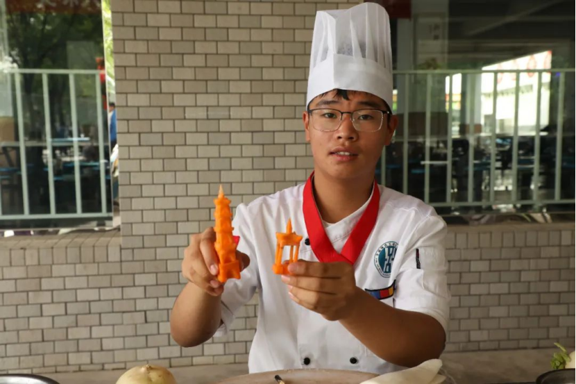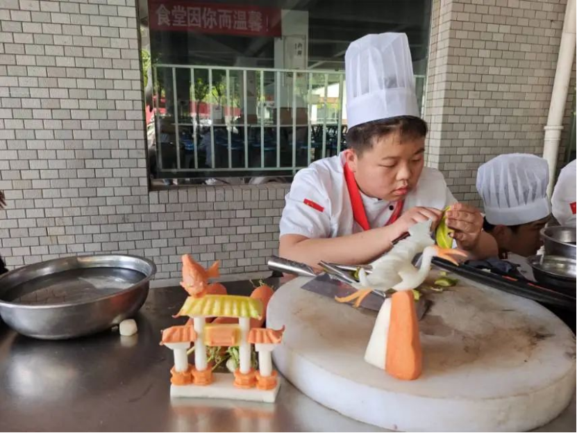 在文化广场,中学生们化身“小小厨师”,在专业教师指导下学习食品雕刻技艺。白萝卜在刻刀下逐渐变成飞舞的仙鹤,黄瓜皮化作翠绿的“竹叶”,白萝卜和胡萝卜雕刻出的“鱼跃龙门”造型更是萌趣十足。“下刀要稳,手腕放松。”烹饪专业老师手把手教学,初二王同学成功完成人生第一个雕花作品,“没想到做菜也能这么美,像艺术品一样!”