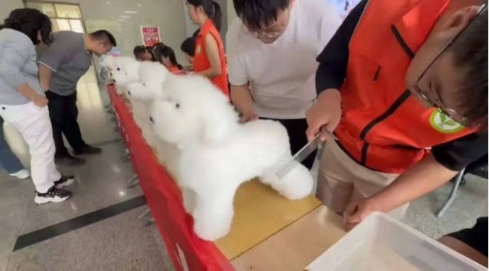 同学们手持专业剪毛工具,在老师指导下化身“萌宠Tony”。护理专业的小王尝试给模型兔修剪“爱心耳”,却意外剪成“闪电麦昆”,引得全场爆笑:“果然实践出真理!”