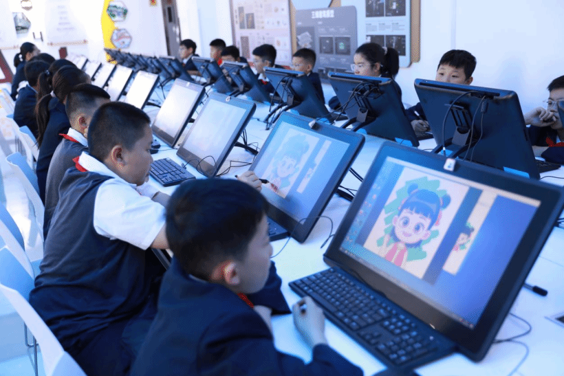 国潮创绘:学生们以当下爆火的“哪吒”以及经典的“黑猫警长”等动画角色为蓝本,运用数位屏进行二次创作。专业教师从示从线稿到动态分镜的全流程创作,展现数字绘画与传统艺术的融合,引导小学生感悟数字技术演绎传统文化的魅力。