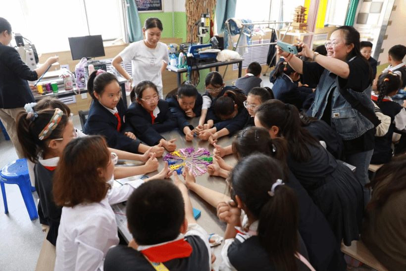 巧手编织:线绳在指缝间穿梭,中国结、蜻蜓等传统手工艺品渐次成形。专业教师现场演示编织技法,传授"挑一压一"基础口诀,培养小学生在动手实践中体验当代工匠的智慧。