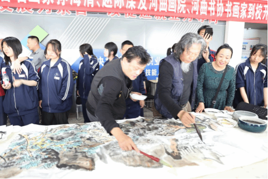 以美育人,以文化人。为深入贯彻落实职业教育相关政策,弘扬中华优秀传统文化,提升师生艺术素养,在职业教育活动周期间,河曲县职业教育中心于5月16日下午3:30,特邀全国著名画家孙海清、赵际滦,以及河曲画院、河曲书协书画家张学聪、张瑞欣、张志坚、李美仙、翟昱源、王永强、徐振荣走进校园,开展中国书画现场教学展示与交流活动,为全校师生带来了一场精彩纷呈的文化艺术盛宴。