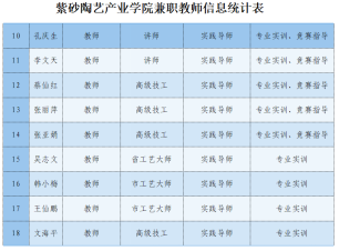 学院与众多企业携手合作,广泛地搜集并整理了紫砂陶艺行业内的杰出人才信息,成功地构建了一个企业兼职教师资源库。这个资源库汇聚了来自不同企业的专业人才,涵盖了丰富的实践经验和技术知识。