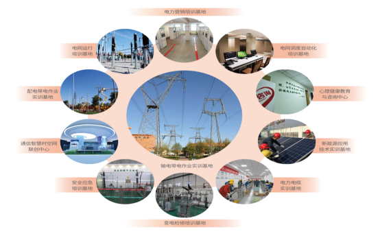 三是打造一流培训基地。坚持校企共建共享,按照“无限接近生产现场、兼具产学研用功能”的定位,打造学生技能成才的“练兵场”。近三年,学院(中心)基地建设项目达27项,总投资达5884.44万元。目前建有电网运行、电力营销、电网调度自动化、电力通信、安全应急、农网配电、输配电带电作业、变电检修、电力电缆等九大生产性实训基地(见图6),基地设施先进、功能齐全,设备总价值近2亿元,培训实力雄厚。电力类专业学生在三个校区之间实施
