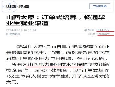 一是创新“现代学徒制”校企双元育人培养模式。为强化精准对接、人岗匹配,依据产业链分工对人才的要求,按照“一企一案”原则,与合作企业联合进行单独招生,共建共享实训室,共同制定课程模块,共同完成教学任务。学生在校期间,企业设立奖助学金,选派高级工程师担任班主任参加实践教学,真正实现了“入学即入企、毕业即就业”。学院(中心)先后与山西电建检修、山西中来光能、北京合纵、北京华电伟业、山西兴高能源等多家知名企业开展联合培养项目,该项目曾被新华社进行专篇报道(见图3),在