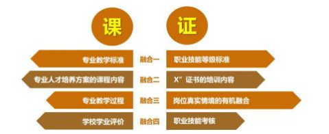 有了证书有了试点的学生,接下来我们的工作也开始逐步进展到课证融合的工作。课证融合是基于“1+X证书”制度稳定、有序落实的基础上提出的保障性教育理念和措施。在“课证融合”中,“课”主要指的是专业课程体系,“证”则指的是职业技能证书,“课证融合”理解为专业课程体系与职业技能证书获取的融合,即将职业技能证书考试的相关要求融入专业课程内容中,实现课程围绕职业技能考试,职业技能考试引导专业课程的职业教育新模式。“课证融合”的总体目标是以学历证书与职业技能等级证书这两类证书内涵的衔接与对应为前提,以学校为主体,以专业为依托,以课程为载体,通过调整课程设置、更新课程内容、改进教学方式、完善实习实训条件、提升教师“双师”素质和优化评价与考核等措施,在专业培养过程中实现四个“有机融合”。
