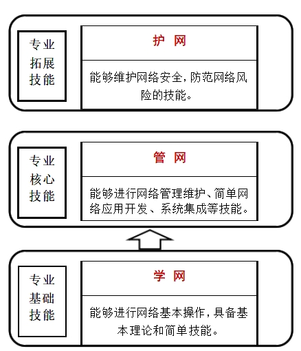 课程体系融入“红色网络精英”元素。在“学网”教育阶段 便通过课程思政,将国家安全教育融入专业基础学习中;在“管 网”教育阶段,将做一个有职业操守的网络管理员作为立德树人 教育的重要内容融入专业核心技能学习中;在“护网”教育阶段,通过学习《中华人民共和国网络安全法》、《信息安全等级保护 管理办法》等国家法律,进一步帮助学生树立“学网”、“管网”、 “护网”的职业意识。通过考取华为 HCIA、HCIP 等证书培养学 生数据通信模块的专业技能,通过考取 1+X 相关网络安全证书培 养学生管网、护网技能。通过“网络管理”、“风险评估”、“等 保测评”等阶梯式岗位,提升学生专业水平。