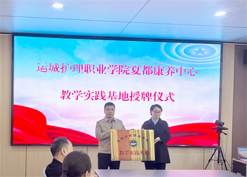 为深入贯彻落实国家“健康中国2030”战略和山西省关于深化产教融合、推动大健康产业高质量发展的部署要求,2025年3月20日,运城护理职业学院与中晟颐悦夏都康养中心举行教学实践基地授牌仪式。运城护理职业学院院长宋丽华,夏县县委副书记、县长李雷,县委常委、副县长李琳,中晟颐悦夏都康养中心总经理谢满军出席仪式,运城护理职业学院党政办公室、教务处、护理系、继续教育中心相关负责人参加。仪式由李琳主持。