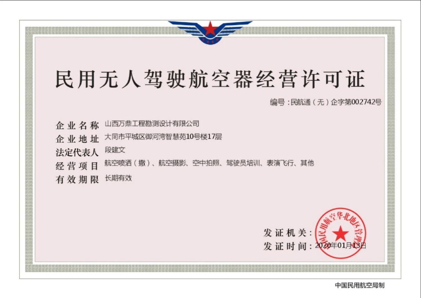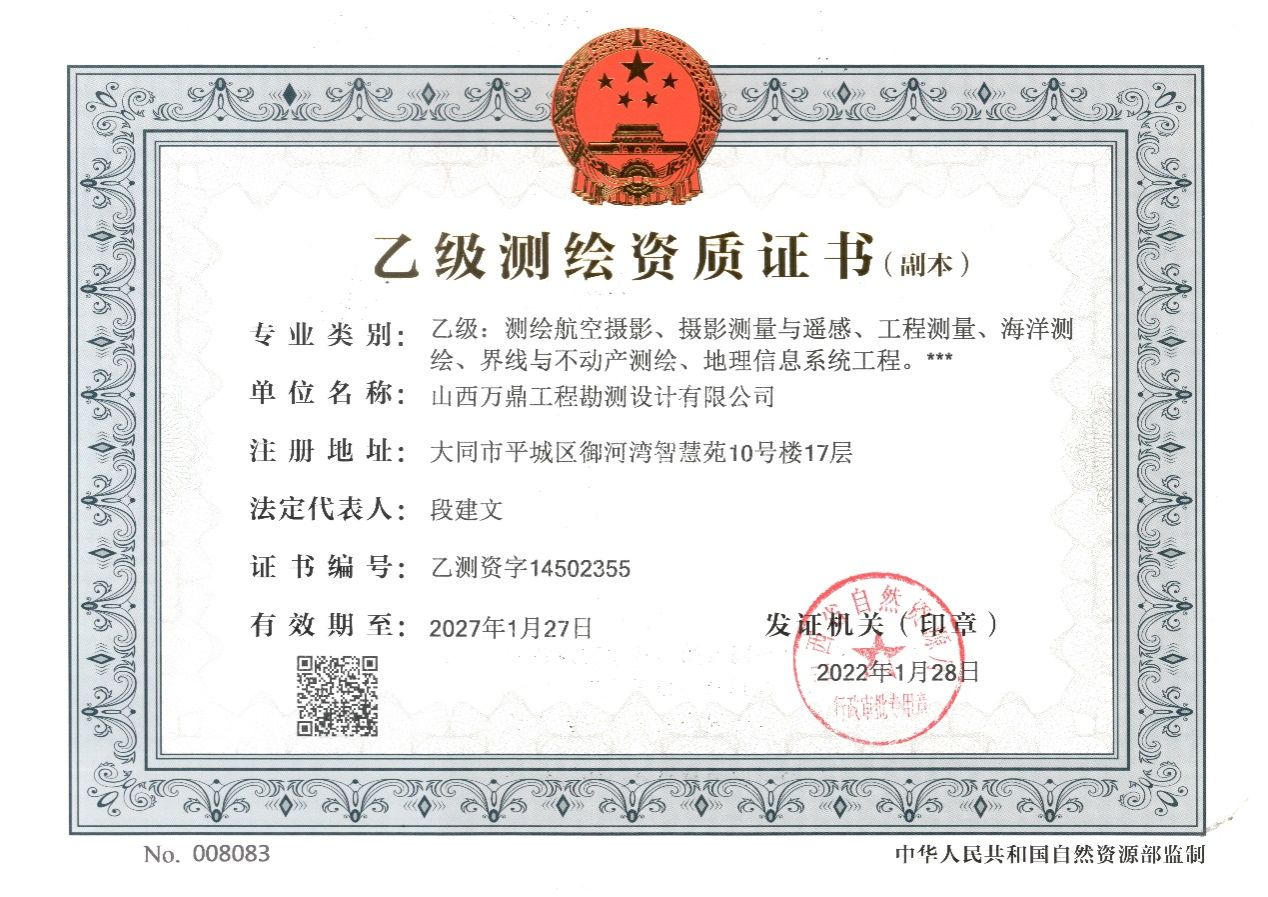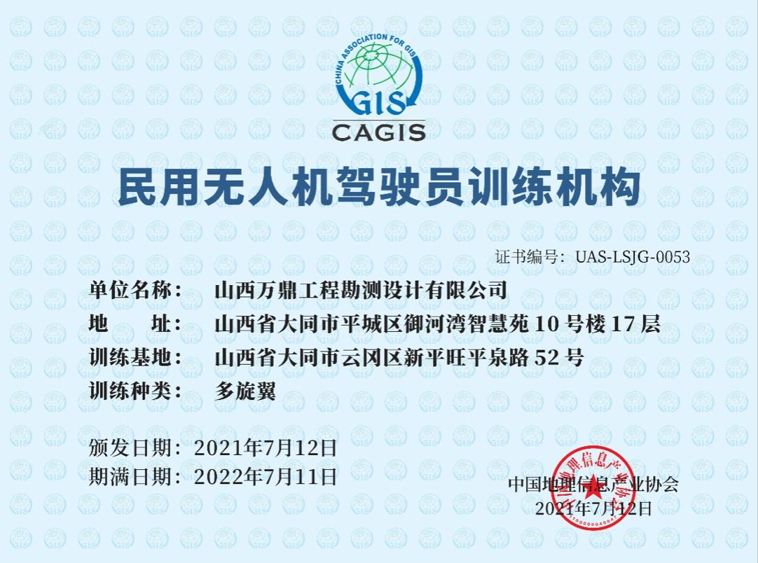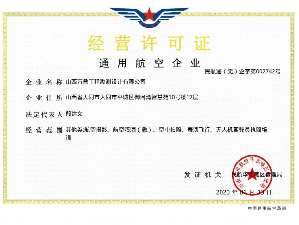 企业资质:测绘乙级、土地规划乙级、城市规划乙级、市政设计乙级、矿山开发治理技术服务、通用航空经营许可、民用无人驾驶航空器经营许可、CAGIS民用无人机驾驶员训练资质。