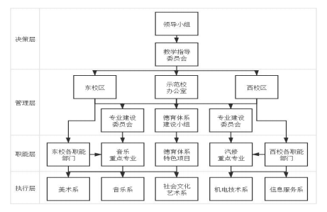 成立了“示范校项目建设领导小组”,校长任组长,分管校 长为副组长,三个项目负责人为核心成员,所有中层领导为组员, 设立示范校建设办公室,构建全员参与的“决策层—— 管理层—