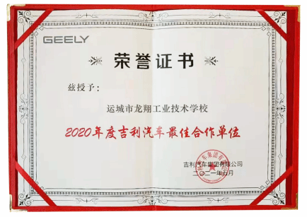 1.校企共同修订技能人才培养方案。双方联合成立校企合作委员会,共同商讨人才培养方案和课程设置,委派企业专家和技术骨干担任核心技术课程,渗透吉利文化和企业制度,确保订单班教学管理的实效性;邀请行(企)业专家参与学生期末技能考核,确保人才培养规格的实用性,初步建立了“教考分离”人才培养考评机制。2021年,学校荣获了“2020年度吉利汽车最佳合作单位”。