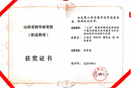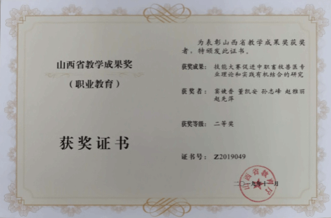 通过以上项目建设,我校在教学模式的改革实践、职业农民的培育、人才培养上均取得了一定成绩,取得了省级教学成果5项:《“三农”服务和精准扶贫视阈下现代养殖业职业教育与职业培训体系的创新与实践》获得2019年特等奖;《新型职业农民培育和基层农技推广体系对接培养模式的研究与实践》获2019年度二等奖;《技能大赛促进中职畜牧兽医专业理论和时间有机结合的研究》获2019年二等奖;《高素质农民培育与农技人才评价体系对接培养模式的推广应用》获2021年二等奖;《中职畜牧兽医专业“指导-自学-实践”三结合教学模式的改革与实践》获2021年二等奖。《“三农”服务和精准扶贫视阈下现代养殖业职业教育与职业培训体系的创新与实践》获得2019年特等奖