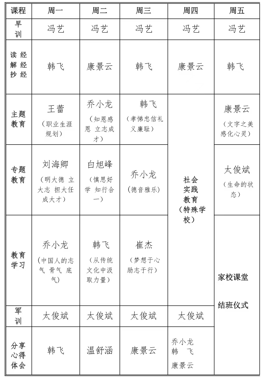 (三)工作流程:开班—传统文化教育—思想教育—心理教育—思政教育—劳动教育—社会实践教育—家校共育—结业。