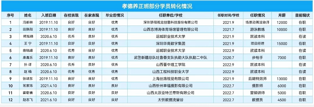“孝德养正班”毕业生转化情况及目前现状