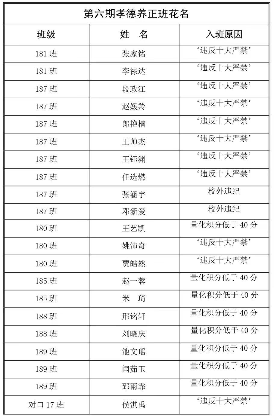 (一)学员组成:违反《学生日常行为准军事化管理考核条例》“十大严禁”规定及个人量化积分低于40分的学生;