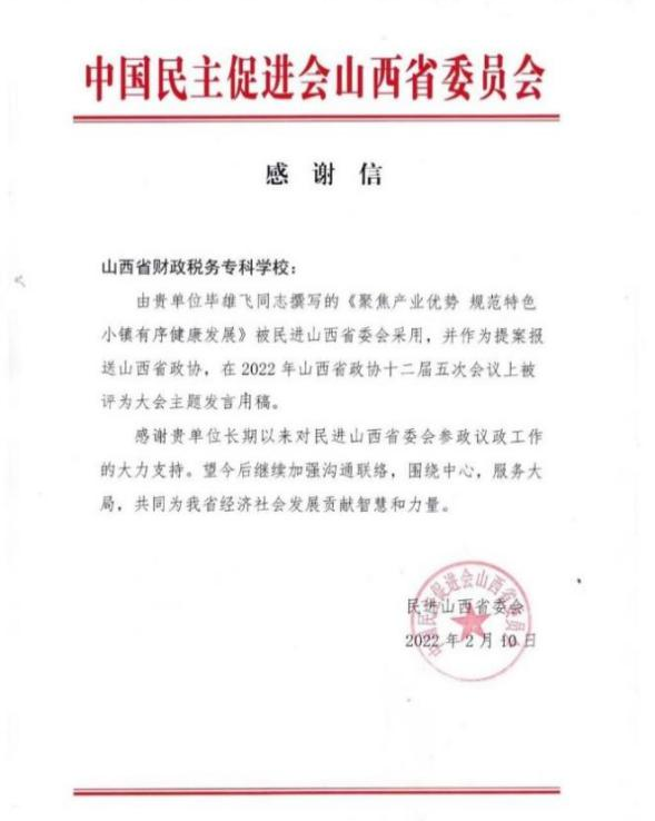 学校积极参与乡村振兴的地方政策研究和制度设计,市场营销专业群教师撰写的《聚焦产业优势规范特色小镇有序健康发展》咨询报告被山西省政协列为2022年山西省政协十二届五次会议上主题发言用稿,对山西省乡村振兴中的特色小镇创建提供了积极而有效的职教智慧。