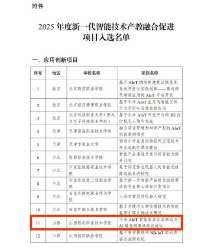 4月30日,教育部职业教育发展中心公布了2025年度新一代智能技术产教融合促进项目入选名单,根据《关于新一代智能技术产教融合促进项目申报工作的通知》(教职中心〔2024〕32号)要求,经专家遴选,最终确定入选项目171个(其中应用创新项目100个,人才培养项目67个,职教出海项目4个)。其中,由山西机电职业技术学院申报的《小米AIoT智能家居设备调试与AI模型部署课程包建设》项目成功入选2025年度新一代智能技术产教融合促进项目应用创新项目。