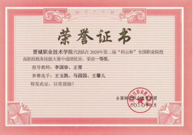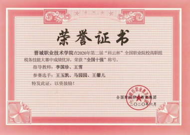 u 2020年第二届“科云杯”全国职业院校高职组税务技能大赛荣获“全国十强”称号