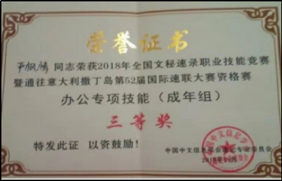 u 2018年全国文秘速录职业技能竞赛暨通往意大利撒丁岛第52届国际速联大赛资格赛三等奖