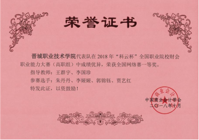 u 2018年“科云杯”全国职业院校高职组财会职业能力大赛(高职组)比赛荣获全国网络赛一等奖