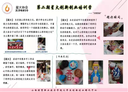 以建立星火创新创业学院为目标,打造星火“双创”学生社团、敢闯会创辅导员工作室、星火“双创”训练营为一体的学院创新创业工作协同育人品牌。
