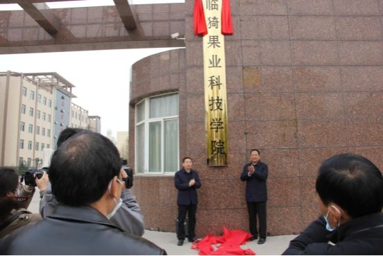 农职院党委书记张作伟(右)与临猗县县委书记于鹏飞(左)出席“临猗果业科技学院”挂牌仪式、