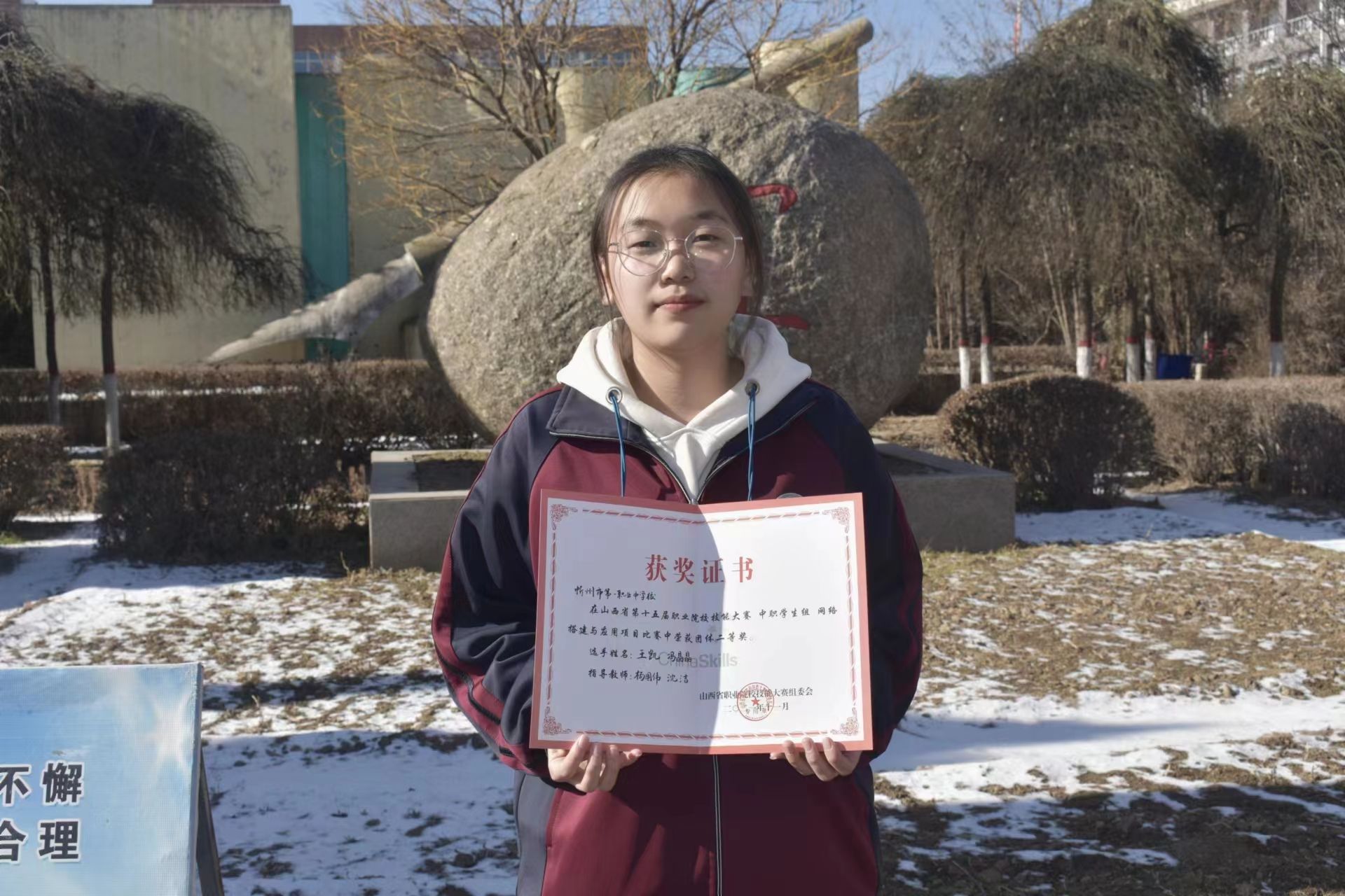 在高一到高三期间学习成绩一直稳居班级第一;高二、高三学年两次荣获学校励志奖一等奖;在高二获得5G“1+X”证书;在第山西省第十五届职业院校技能大赛中职学生组网络搭建与应用项目比赛中荣获团体二等奖。