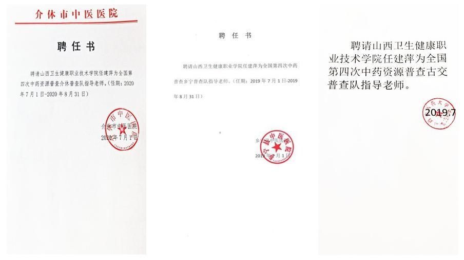 中药资源普查是一项具有重大现实意义和深远历史意义的工作,新中国成立后,全国共计开展了三次中药资源普查,分别是1960-1962年的第一次、1969-1973年的第二次、1983-1987年的第三次。在2019年、2020年,山西卫生健康职业学院药学院任建萍教师有幸参加了全国中药资源普查第四次中药资源普查工作,分别担任山西省乡宁县、古交市、介休市普查队指导老师,为助力服务全面建成小康社会、助力乡村振兴战略、服务美好尽了绵薄之力。