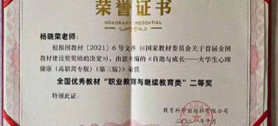 由于多方面工作成绩突出,曾荣获系统“职业道德标兵”、厅局“优秀党员”、“优秀党务工作者”荣誉称号,并多次评为学院“优秀党员”、“优秀党务工作者”、“先进工作者”、“优秀班主任”,曾被山西省心理学会多次评为“心理健康教育工作先进个人”。在山西省首届校园心理情景剧大赛中,其创作并指导的两个参赛作品分获大赛二、三等奖,同时获得“最佳指导教师”。2021年10月,该同志主编的《自助与成长——大学生心理健康(高职高专版)》心理教材荣获全国优秀教材“职业教育与继续教育类”二等奖。