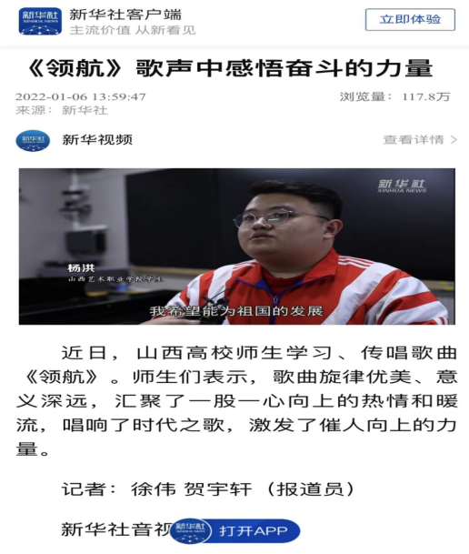 “伟大的中国共产党,乘风破浪,扬帆远航,领航中国在新时代的征程上……”在喜迎新年的元旦,一首气势磅礴的主旋律歌曲《领航》在山西各地争相传唱。杨洪同学作为山西大学生代表也有幸参与了歌曲《领航》的传唱,并接受了新华网的采访,该报道浏览量一度突破100万,成为当月新华网采访热点视频新闻。