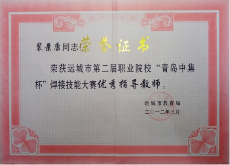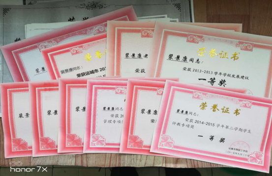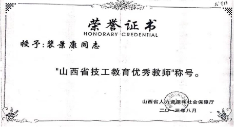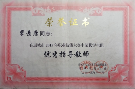 在校至今我多次获得学校颁发的荣誉证书:实训组织奖、教案评比奖、学生最喜欢的教师奖、公开课优秀教师等奖项。