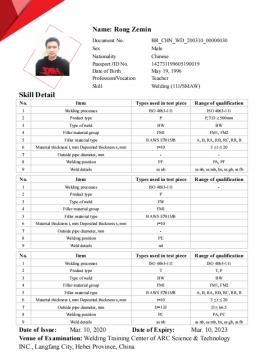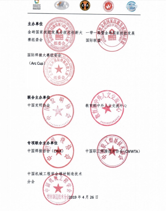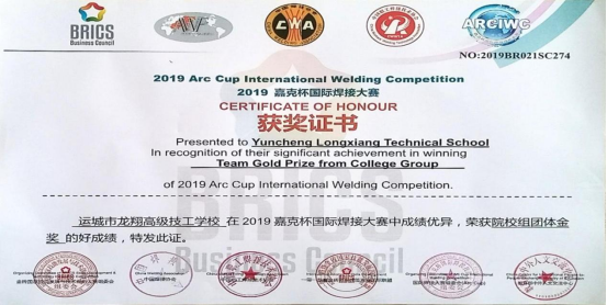 2019年经陶校长批准,在校各级领导支持下,强化训练3个月。于9月4号—10号,我带领龙翔焊接选手参加2019 一带一路暨金砖国家技能发展与技术创新大赛之“嘉克杯”第七届国际焊接大赛,在这次“嘉科杯”国际焊接大赛中获得了优异的成绩。我校参赛选手四人(教师组荣泽民、张代星;学生组李佩涛、姚松),获得个人奖项五项:教师:荣泽民获青年组二等奖;学生:111焊接项:李佩涛获得一等奖,姚松二等奖;135焊接项:姚松获二等奖,李佩涛获得三等奖,共获得获得个人奖项五项,获得“团体金奖”一项。