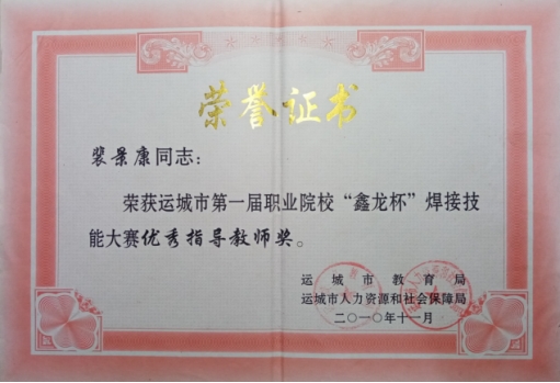 我是裴景康,1991年开始学习焊接技术,2009年3月加入龙翔工业技术学校,是一名普通的焊接专业教师。通过不断学习焊接技能,考取了焊接高级技师、1+X考评员、焊工考评员、运城市技能人才储备库焊接专业技术人才、2016年被评为运城市五一劳动节“爱岗敬业”劳动模范。