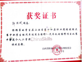 2010年5月,龙翔建校三年,我们开始参加山西省第四届“广达杯”汽修技能大赛。12年来共取得市、省、全国大赛各类奖项30余项,以下是部分获奖证书。
