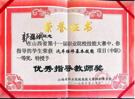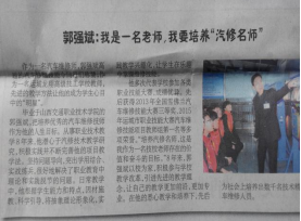 让我至今难以忘怀的是其中的一次获奖经历,那是2013年5月,我带领学生在山西省第七届“广达杯”汽修技能大赛取得第一名的好成绩,按照比赛选拔规则,我们获得了参加国家大赛的资格。