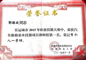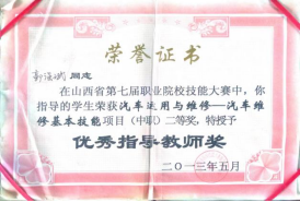 苦心人天不负,6月20日我和学生赴江苏省无锡市汽车工程学校首次代表运城参加2013年全国职业院校“雪佛兰杯”汽修技能大赛并最终获得三等奖,600多名选手我们位列第28名,而且是当年山西省汽修类的唯一奖项,填补了我们运城缺席全国大赛并获奖的历史空白。